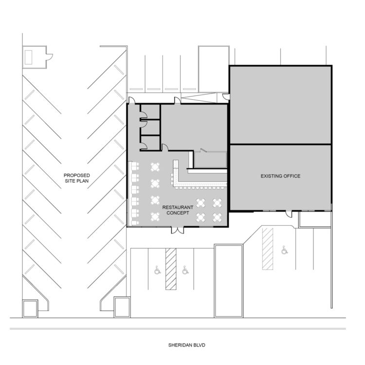 2465 Sheridan is a 7,900 s.f. office building at the edge of Edgewater, CO. Arrow B was hired to give the building a facelift to attract prospective tenants and analyze subdividing the building into a mixed use, multi-tenant redevelopment with a restaurant and rooftop bar overlooking Sloan’s Lake.