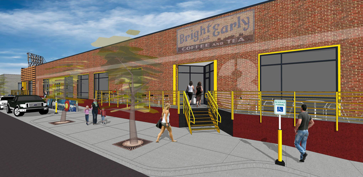 Design elements were reclaimed from the demolition of an adjoining warehouse. Bow string trusses were used to create exterior canopies. Compound steel columns were used to create iconic entry elements. Wood purlins were reused for signage and accents. Stairs and ramps were developed to provide opportunities for public art, livening up the building and reflecting the neighborhood’s colorful history.