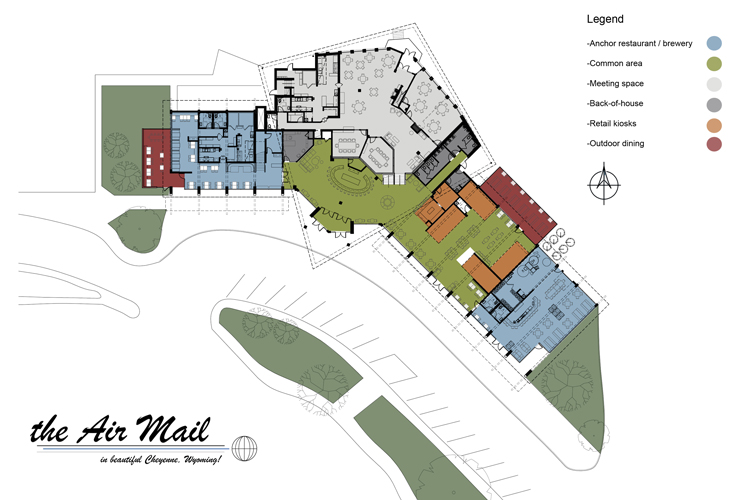 Undeterred and unwilling to let the idea go, Arrow B was in love with its history, its design, and its potential. We held internal design and branding charettes and conceived The Air Mail – a community food hall and gathering space with vintage branding steeped in Wyoming history and Aviation Americana. De Havilland’s Steakhouse and the Chugwater Silo Beer Company serve as anchor tenants, while the Beacon 38 Bar and Shy Annie’s Ice Cream activate the common area with sophisticated cocktail service and a vintage soda fountain recalling a simpler time, while guests to roam through exhibits and displays detailing the city’s contributions to history. Protected outdoor dining spaces serve as intimate enclosed patios or open food hall picnic tables for watching the runways. Shipping container kiosks serve as incubator spaces for fledgling retail and food and beverage concepts. The Airside Conference Center (with full food service) would fill meeting space needs for the community and make the center viable to serve all day-parts. A second-floor addition creates additional gallery/event space with panoramic views of the botanic garden, airside runways, and downtown.