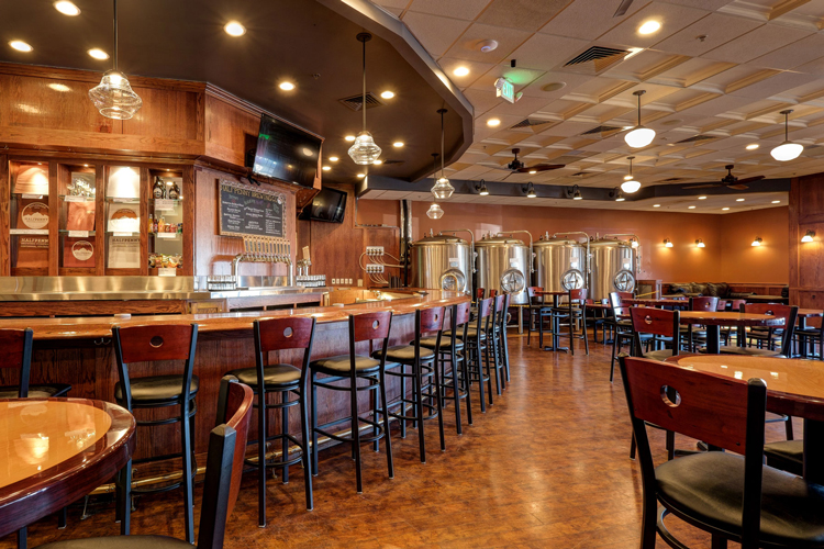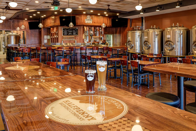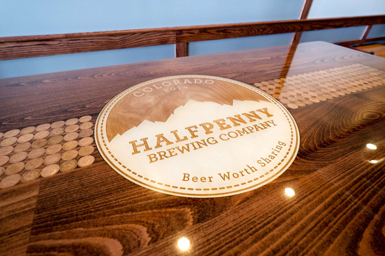 Halfpenny Brewing Company is a fresh addition to the Arapahoe Village Shopping Center in Centennial. Halfpenny provides a traditional English pub atmosphere and a menu of English, German, and American style beers all created using a 10-barrel system. The space is the former home of the massive (10,500 sf.) Fox & Hound Pub and billiard hall. Arrow B subdivided the space into separate tenants, dividing utilities and restrooms and updating the existing storefront. Arrow B also worked with Stark Solutions to create custom millwork and fanciful custom tables with the Halfpenny logo and pennies embedded in the surface.